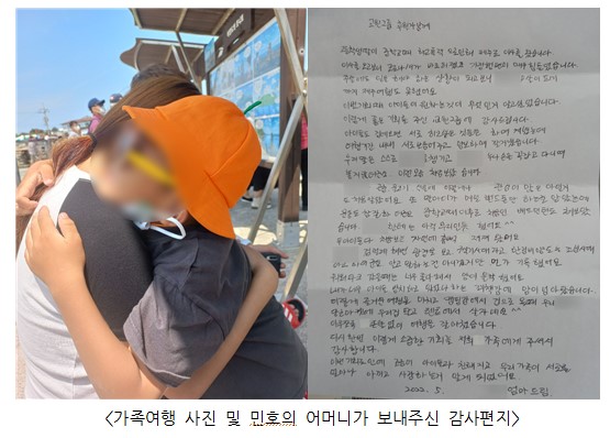 민호의 가족은 심리상담을 진행하는 과정에서 부모 상담과 가족여행 등 가족들이 함께하는 프로그램을 통해 서로를 이해하는 시간을 가졌습니다. “아이들도 집에 오면 서로 하고 싶은 것들을 하며 지냈는데, 여행 기간 내내 서로 보담어 주고 양보하며 잘 지냈습니다.” “우리 딸은 스스로 민호를 챙기고 민호는 누나 손을 꼭 잡고 다니며 놓지 않더군요. 이런 모습 처음 보았습니다”