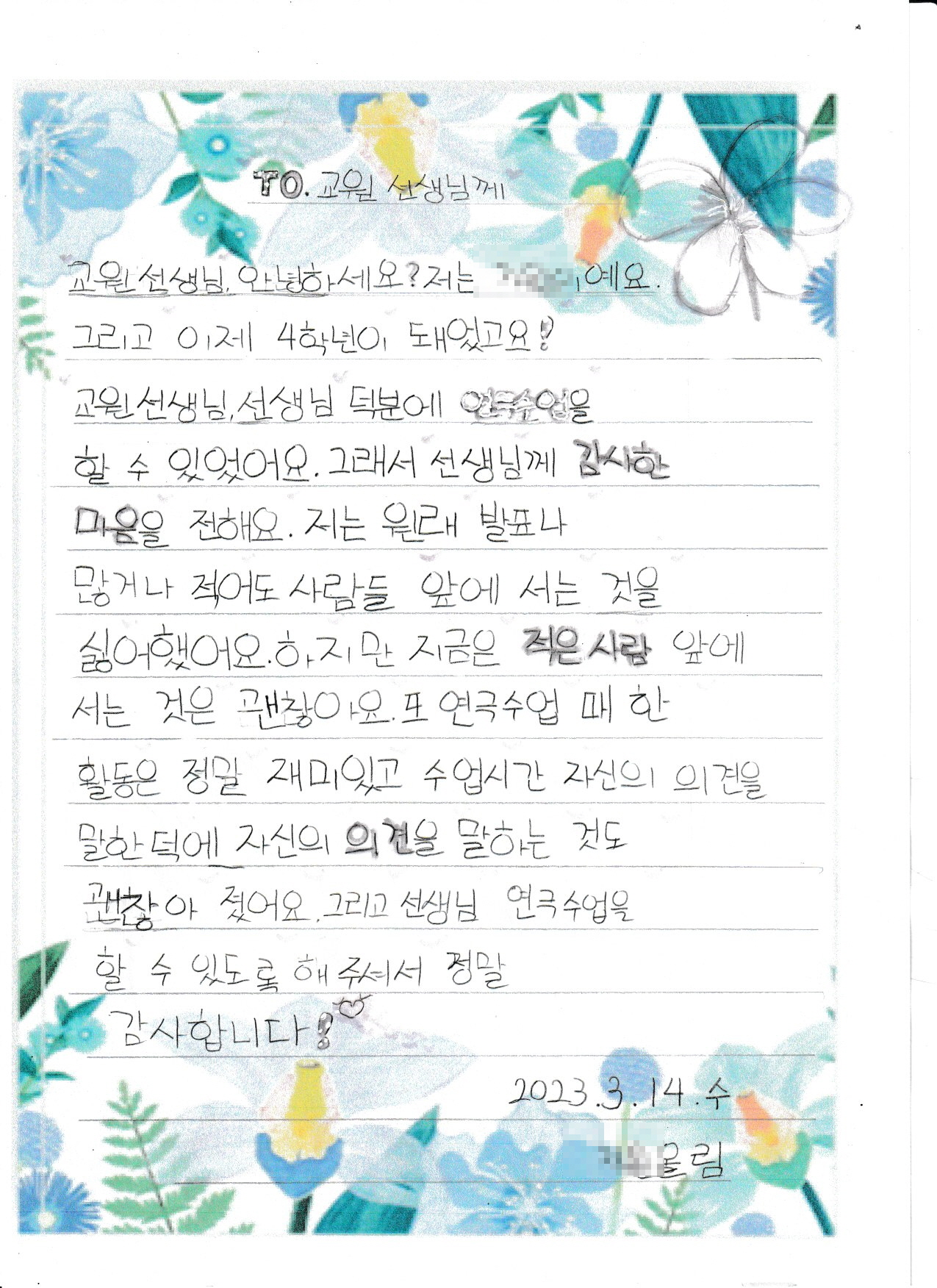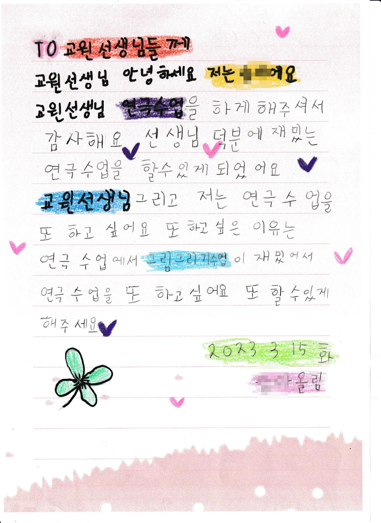 자신의 욕구와 감정을 잘 몰라 표현에 서툴렀던 아이들은 연극심리상담을 통해 자신과 타인의 감정을 헤아리고 수용하게 되었습니다. 또한, 다양한 역할 연기를 통해 내면의 힘을 키울 수 있었습니다. 때론 마음대로 되지 않아 속상해 하는 모습을 보이기도 하고 감정 조절을 힘들어할 때도 있지만, 곰곰이 생각해보고 행동하거나 변화하려 노력하는 모습 등을 보이기도 합니다. 아이들이 긍정적으로 변화될 수 있도록 지원해주신 교원그룹과 후원가족분들께 진심으로 감사드리며, 앞으로도 이 아이들이 밝고 건강하게 잘 성장할 수 있도록 응원해주시기를 바랍니다. 감사합니다.